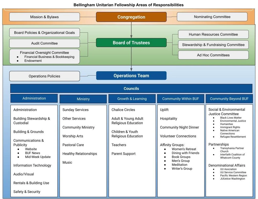 Bellingham Unitarian Fellowship’s organizational structure is made up of five major Councils (teams):
